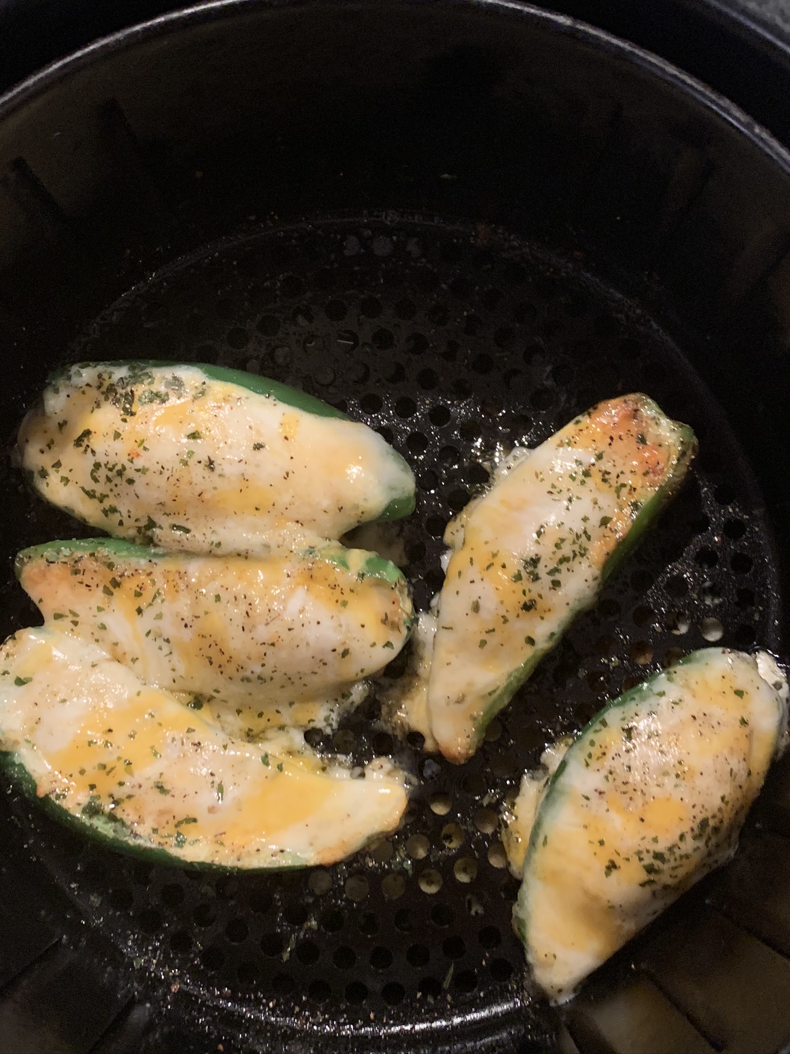 Dish #1: Jalapeño peppers 🌶 split and stuffed with Mozzarella, Parmesan and shredded Cheddar cheese cooked in the air fryer.